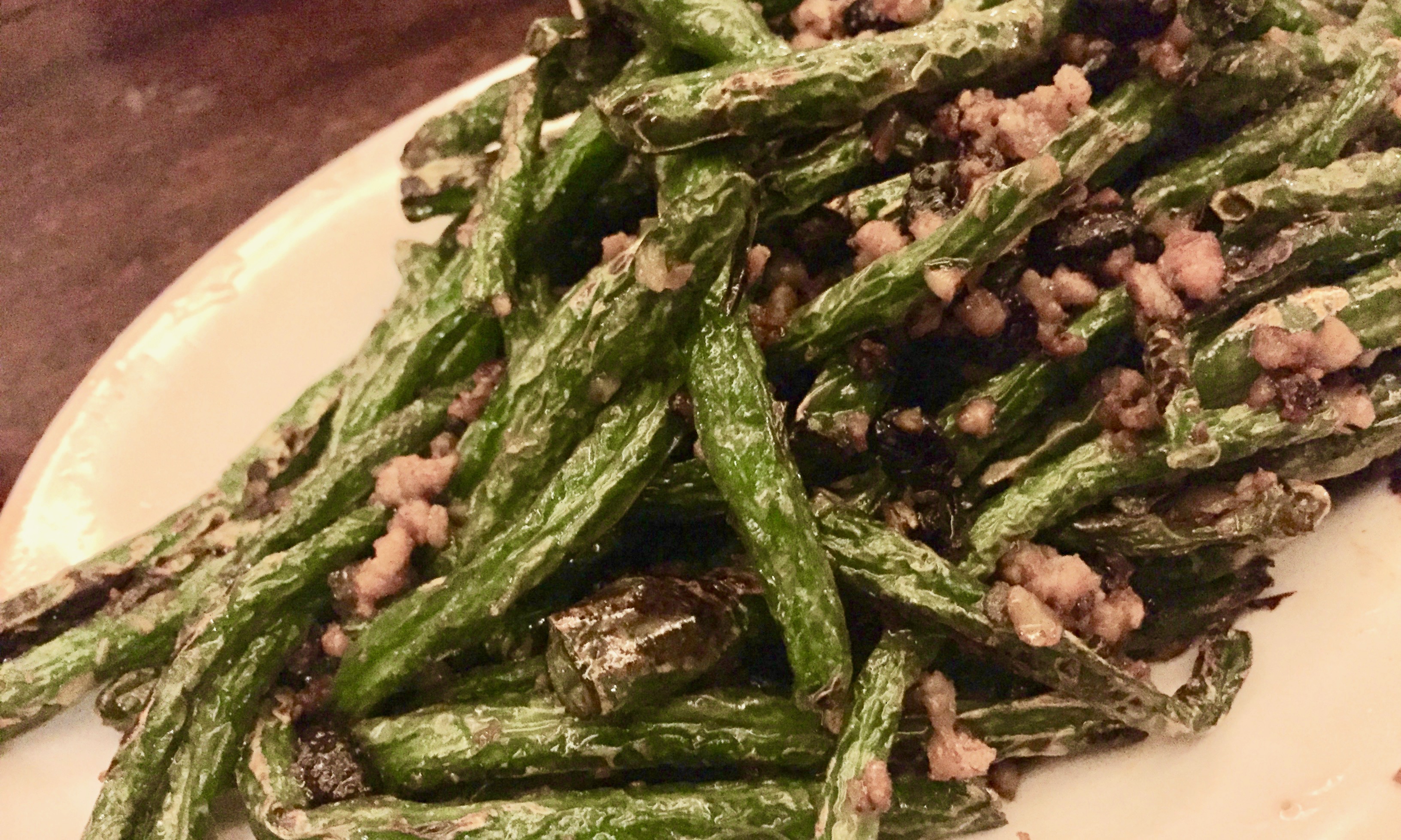 Pressing the bean down gives it that dark singed bits; it helps dry out any grease. This process is the gan bian. The deep fried beans are then quickly stir fried with a dollop of ground pork, and little morsels of suan cai (pickled vegetables) and chili.