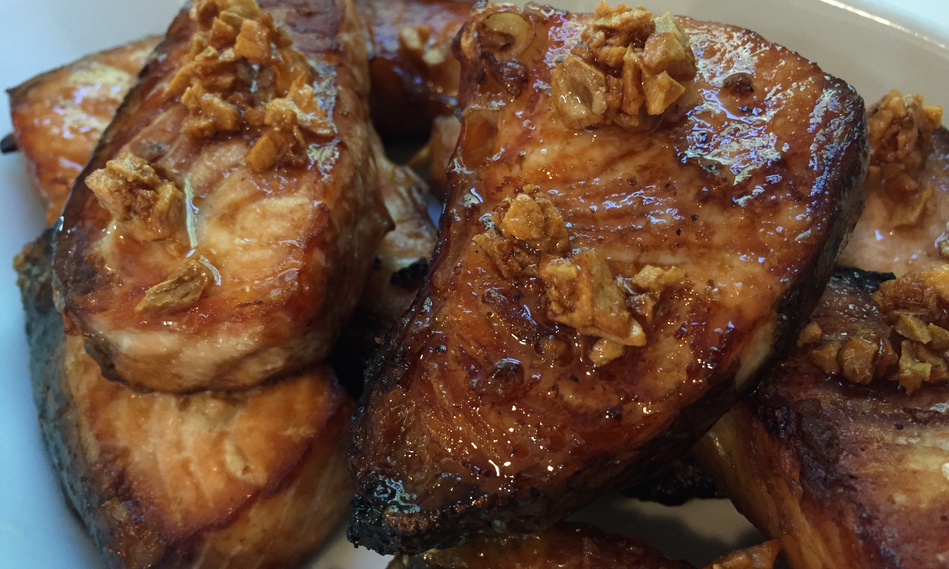 –Salmon chunks: This is an attractive way to serve. Cut salmon fillets into serving cubed sizes and steaks into quarters. Marinate chunks in above marinade and then transfer to a lined baking tray for broiling. Make sure there is enough space between the chunks so it will broil efficiently. Broil for about 6 -8 minutes, until the sides of the chunks are firm and a little crispy. When cooked, use a wide spatula to transfer salmon on to a serving dish. Garnish with fried garlic, and then dribble a Soy Sauce Dipping Sauce over it.