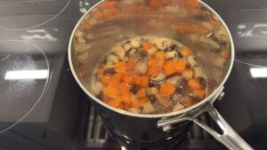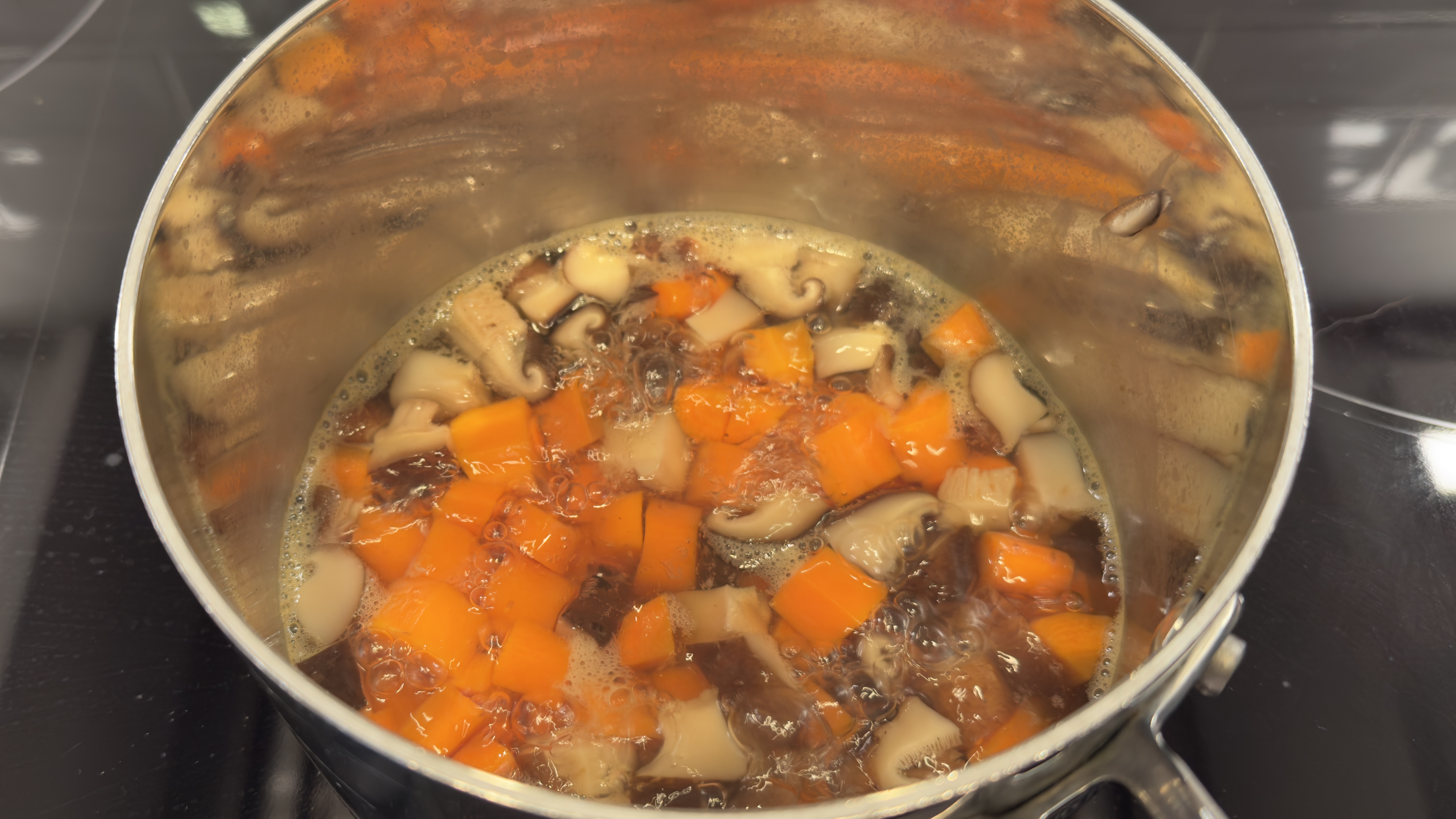 In a 3-quart sauce pan, bring 2 cups of water to boil. Add diced mushroom and boil for 5 minutes. Add carrot, lower heat to medium and cook until carrot is tender. Strain ingredients and set aside.