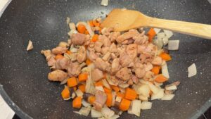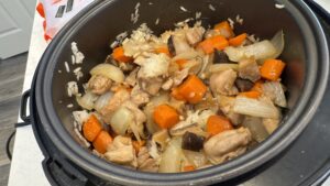 With Nor Mai Gai, you add a lot more ingredients–chicken, mushroom, Chinese sausage, carrot, and onion–doubling the volume of the food.