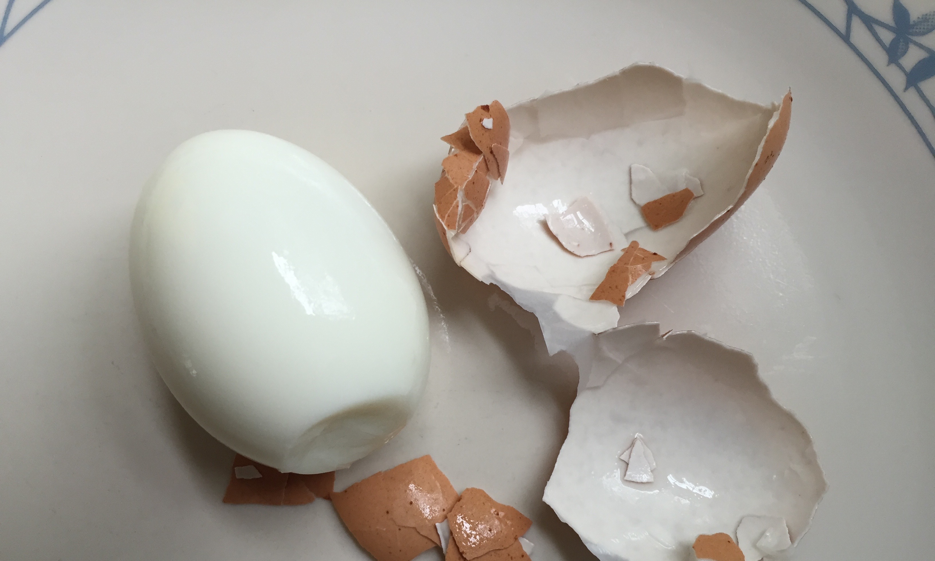 Rolling the egg until shell is evenly cracked makes it easier to peel. When parts of it gets stuck, rinse it under the faucet and look for another part where you can peel off the skin because once you get under there, it strips the shell off the egg, and you get a whoosh of a sense of accomplishment!