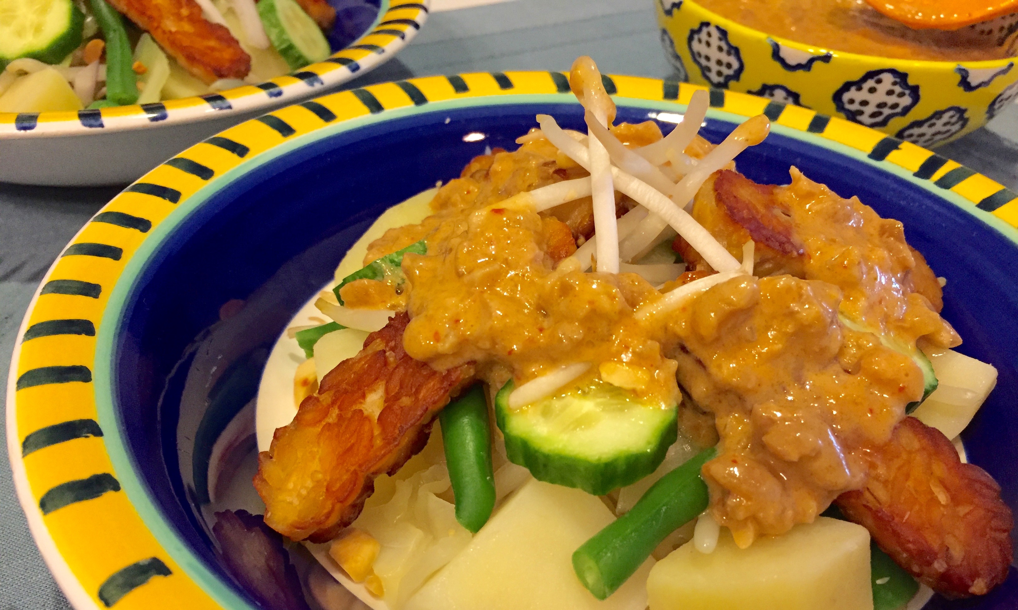 In a large salad bowl, place potato, cabbage, string beans, and bean sprout. Top with tempeh, cucumber and red onions. Pour Satay Sauce over salad. Garnish with chopped peanut.