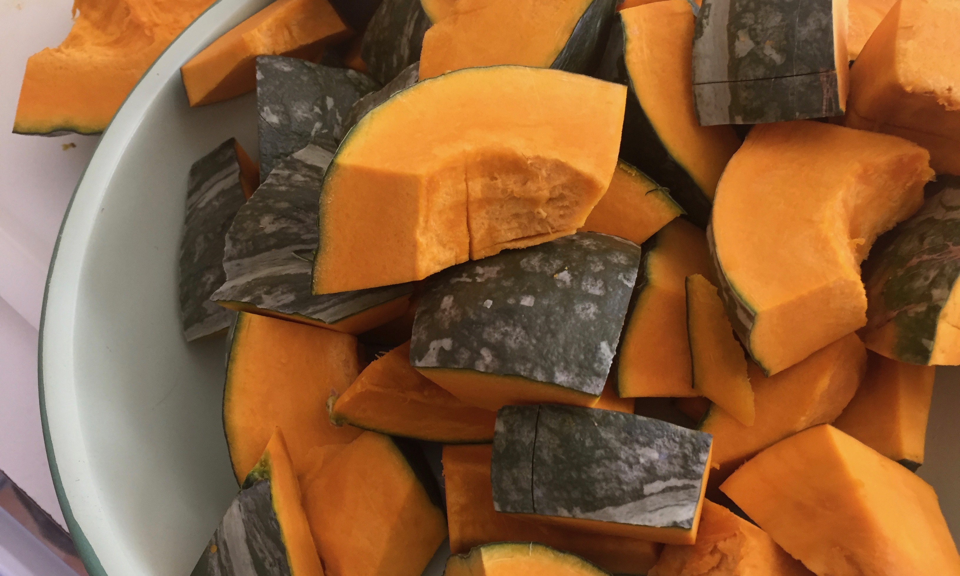 My gourd, kabocha is a tough nut to crack. it’s just quite impossible to even stab the thick skin. So when Ted saw me do it, he took over. I was quite concerned about his fingers. Chi, my friend, said that I could have blanched the pumpkin in water to soften the skin.