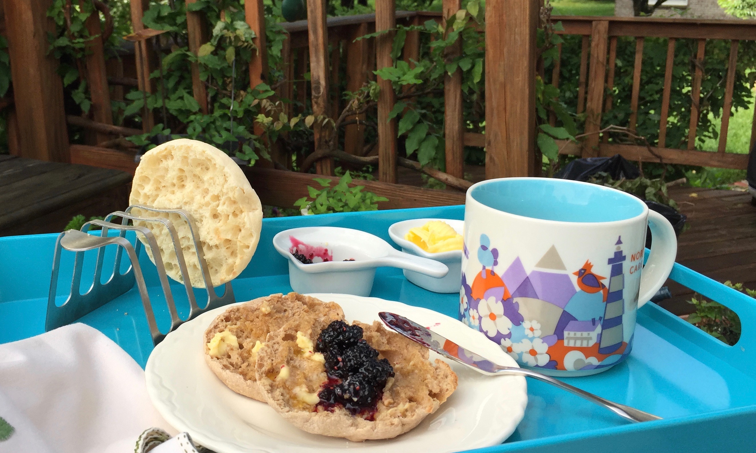 Bearing those treasured memories in mind, I decided to treat myself to breakfast on my deck, making myself a tray with English muffins, butter and homemade mulberry jam. And coffee. We’re American.