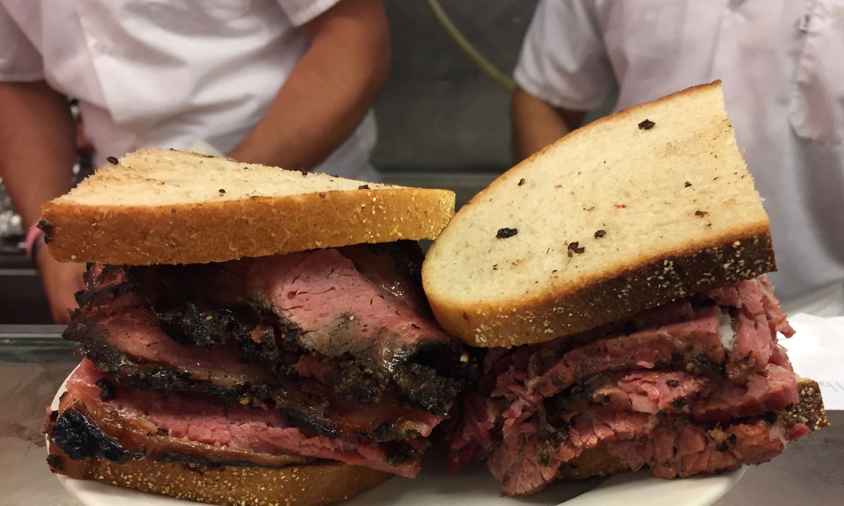 The place was bustling with activity. Busy prep chefs sliced away and willingly offered generous pieces of pastrami for us to sample. Which we shamelessly accepted and raved about.