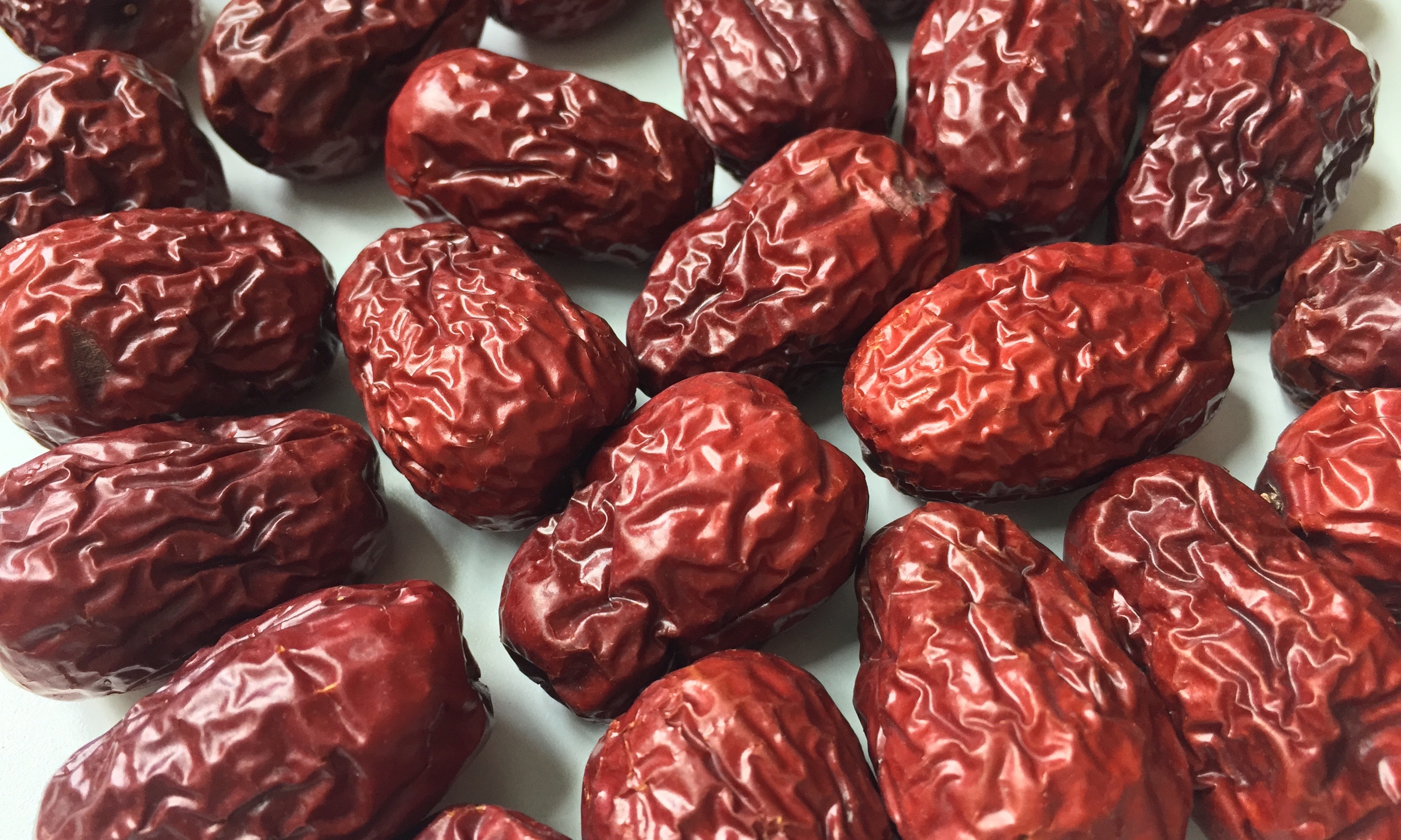 We call it red date, hong zao, but it isn’t date. It’s jujube fruit. While on the tree, the fruit is green and as it ripens it turns red and starts getting wrinkled until it looks like those pictured above. The smaller jujube is typical of what we use. My husband Ted’s uncle, who deals in Chinese herbs, gave us the giant ones.