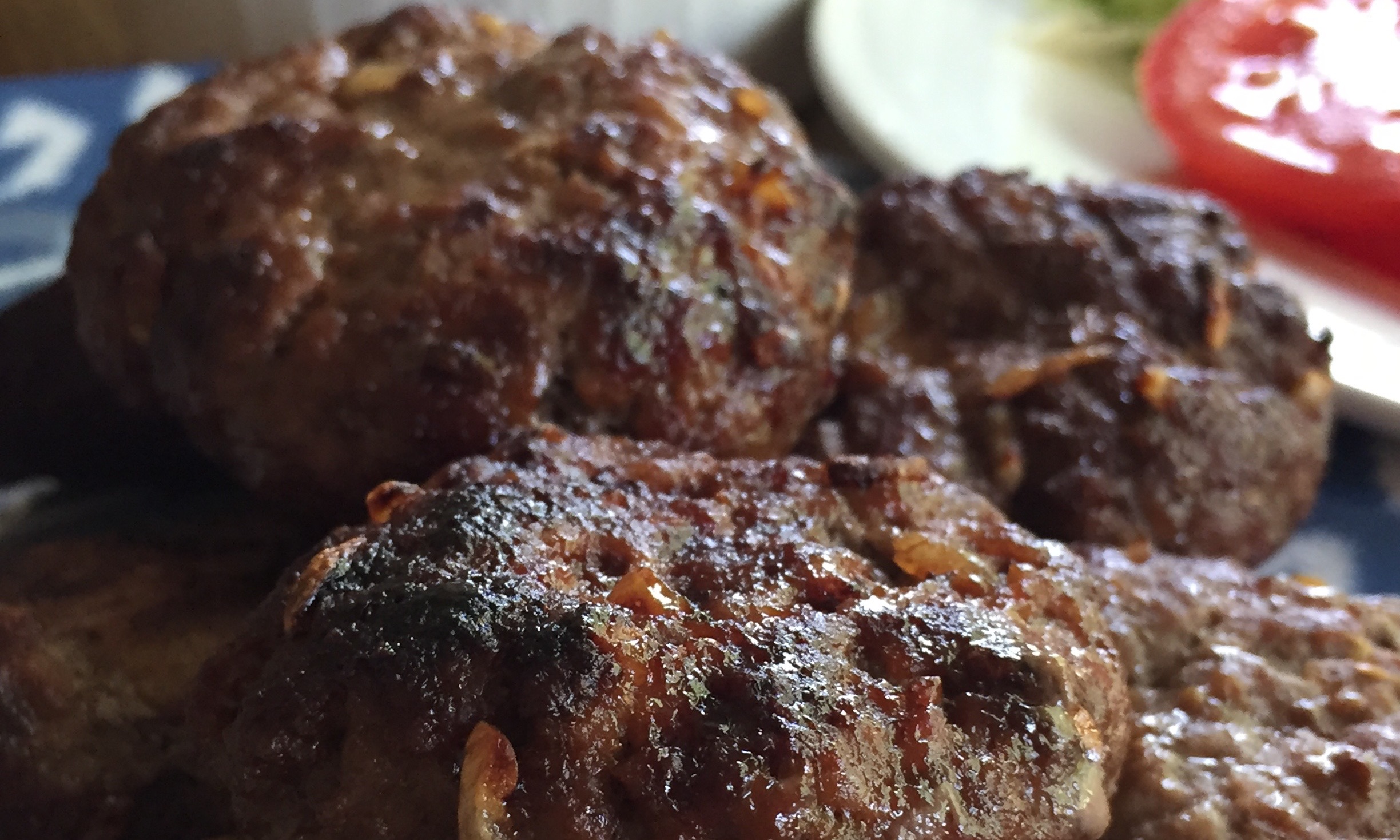 After seasoning, I rolled them gently in balls and parked them in a narrow tray to save space. Kept them in two layers, separated by parchment paper. Just before putting them on the grill, Ted flattened them, adding his signature thumbprint in the middle of the patty to keep the juices in.