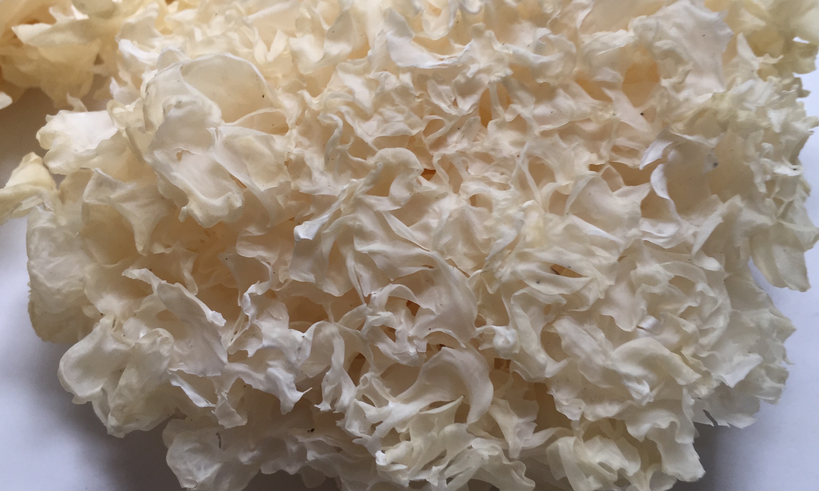 It looks like sponge but this is a fungi–snow fungus, or bai mu er . When reconstituted and soaked it looks beautiful, as shown below. Snow fungus, also sold as tremella, is cooked in savory dishes and desserts.