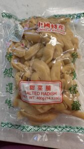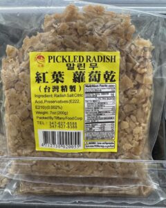 Dried radish–choy bo in Cantonese and luo buo gan in Mandarin–is packaged as Dried Radish or Pickled Radish. IMHO, the latter is a bad translation because it’s more salted and dried than pickled. Below are samples.